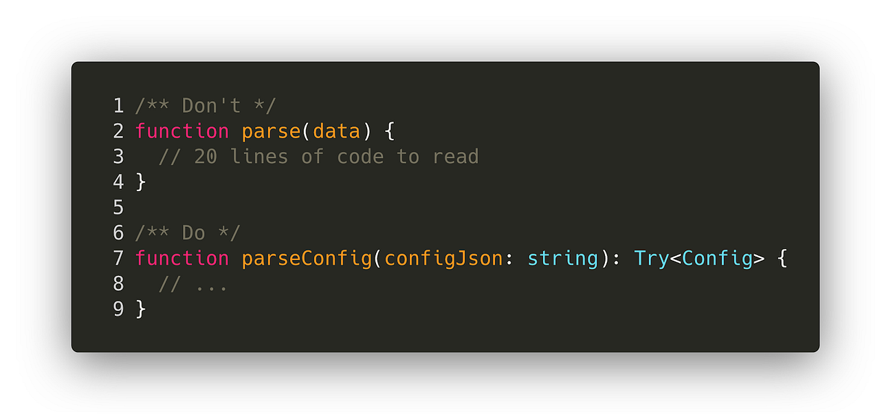 Finally, it’s essential to write functions with a clear and easy-to-use interface. In the example below, the parse function takes a data parameter, and what it does internally may not be immediately evident in its twenty lines of code (to say nothing of much longer functions). If you specify that the function returns Try, engineers using your function later will be grateful, and future engineers will find it much easier to maintain the codebase.