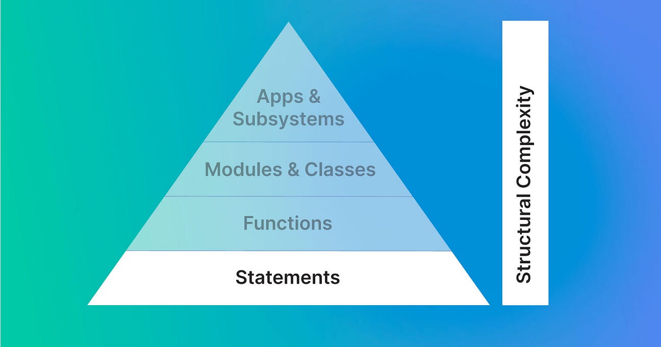 In code, complexity occurs at increasing levels of abstraction. The complexity pyramid shown above is one way to think about how an engineer will encounter them. Let’s climb the pyramid to see what might help us at each level. We’ll need to reconsider basic code blocks that we might take for granted as having mastered: statements, functions and methods, and modules and classes. We’ll even need to reconsider how we think about applications themselves.