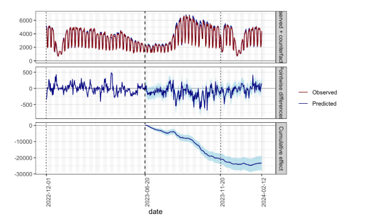 This chart shows the daily and aggregate difference between observed values in a test set and the predicted (synthetic baseline) values in that test set. The synthetic baseline is constructed via a BSTS model trained on historical data in our splits.